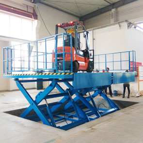 固定式液压装卸平台类似于单叉或多叉升降平台,有基坑或无基坑,增加安全护栏和活动翻板。作为货车装卸货升降平台。 它适用于仓库、车间、汽车、货柜的货物装卸,无需设置货台、钢架等,直接从地面起升装卸。活动搭板的设计能与汽车平滑搭接,叉车能方便、平稳地进行装卸作业,作业完毕平台与地面平整,不占据地面空间,不影响通道通行。